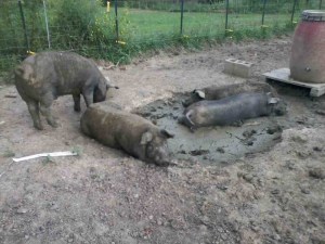 The pigs escaped a total of three times during these summer months.  First they were gone overnight and were back in their pen the next day.  The second time, they forced open their gate and were gone for four days before finding their way home.  Three weeks ago they broke through the electric fencing and were gone for 2 1/2 weeks!  We figured that’s it…. their gone for good now.