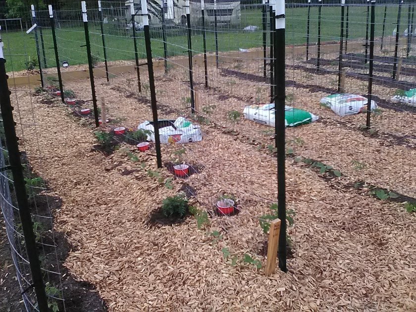 The large tomato patch is made by adding t-post fencing in 20′ rows, adding deep mulch of wood chips, and topping it off with deep rows (raised beds) along each fence trellis.