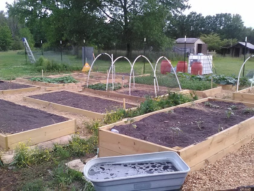 First harvest: Broad leaf SpinachPeas, zucchini, summer squash, peppers and carrots. Beneath the blue tarp is the 18 day grass compost I am experimenting with.tomatoes, beans and marigoldscow panel trellising for cucumbers and beans; herbs beneathNew raised beds being built. These four deep boxes are for potatoes, sweet potatoes, and strawberries.Cow panel trellising connects raised beds for cucumbers and pole beans. The beds beneath the trellis is home to perennial herbs.Eventually all the pathways between the beds will be heavily mulched with wood chips.The tomato patch. 20′ rows of tomatoes, bush beans and marigolds.Red plastic drinking cups protect from cut-worms, and the heavy mulch keeps weeds from becoming a nuisance.