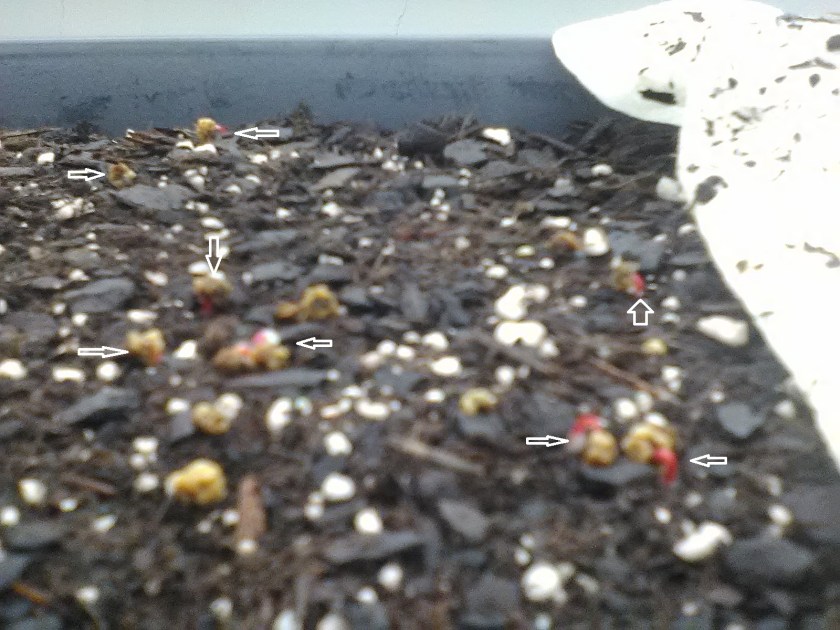 Beet seeds take 5-15 days, but these are already germinating in only 3 days. Since I didn’t have any additional plastic containers, I spread these beet seed atop very damp potting mix in a seed tray then covered them with a damp paper towel and kept all three containers beneath grow lights.