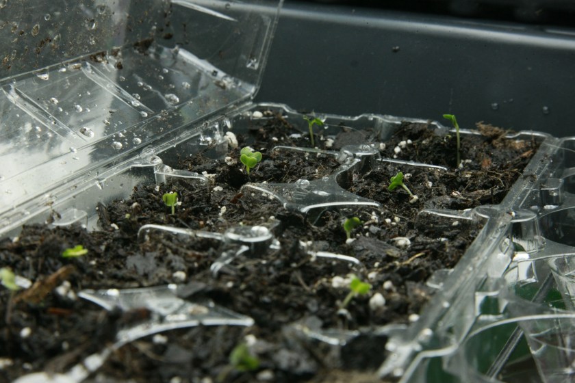 The cabbage seeds have 100% germination and have been transplanted into plastic egg carton cells (the egg cartons are the clear plastic type with two lids) and are thriving.