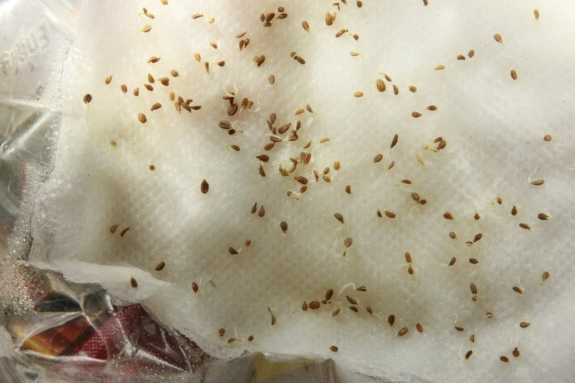 A few days ago I decided to try germinating these bothersome seeds without soil hoping they would be easier to transplant as well as being easier to pick up and thus have less loss of seeds and avoid thinning.